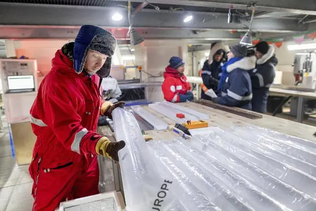 当地时间2025年7月4日,德国不来梅哈芬,阿尔弗雷德·韦格纳研究所(AWI)冰冻圈科学教授在冰实验室的桌上整理几块来自南极的冰样本。研究团队正在检测超过120万年的冰,以获取南极气候和环境变化的数据。视觉中国 图