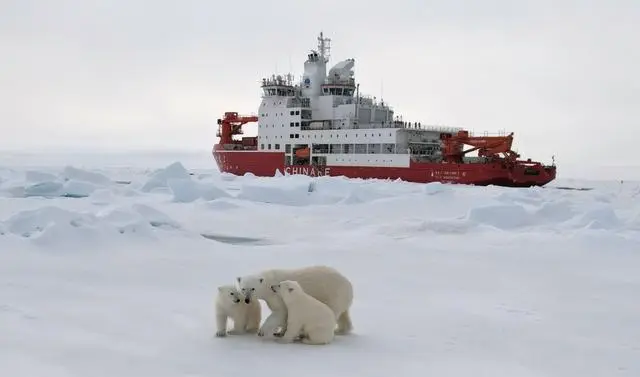 2025年8月30日,在距离中国第15次北冰洋科学考察队长期冰站作业结束还剩一天时,一只北极熊妈妈带着两只熊宝宝出现在了考察队员搭乘的“雪龙2”号极地科考破冰船船边。新华社 图