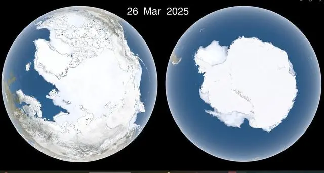 欧盟哥白尼气候变化服务局报告指出,2025年3月,北极海冰覆盖范围创下同期历史最低纪录。这已是北极夏季海冰面积连续第18年(2007-2024年)在9月降至异常低值。与此同时,南极海冰也在2023年9月出现创纪录的低最值。2025年2月,全球两极海冰覆盖总面积跌至历史最低点。