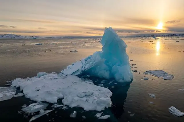 当地时间2025年3月7日,格陵兰努克,航拍图展示了冰山和漂浮在水面的冰块背后落下的太阳。美国国家雪与冰数据中心(NSIDC)于2025年3月27日宣布,今年北极海冰达到的峰值是47年来卫星记录中最低的,全球在不断加剧的人为气候变化的影响下持续升温。视觉中国 图