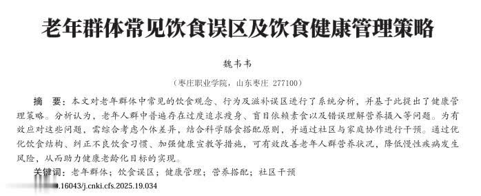 [1]魏韦韦.老年群体常见饮食误区及饮食健康管理策略[J].食品安全导刊,2025,(19)