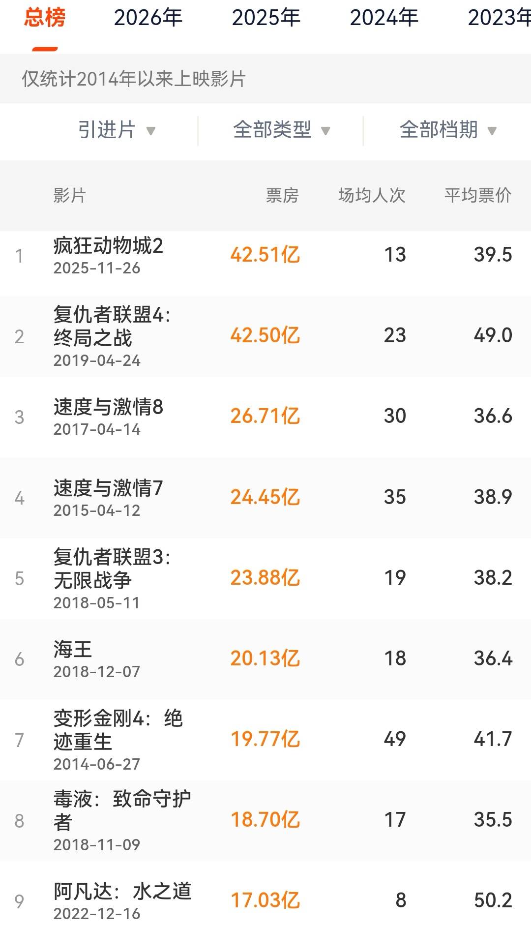 截止2026年1月5日,迪士尼动画电影《疯狂动物城2》在中国内地上映41天,累计票房42.51亿元,超过《复仇者联盟4》的42.5亿元,成为新的进口片票房冠军。 这部合家欢动画每到周末就会爆发,预计其在中国内地市场的最