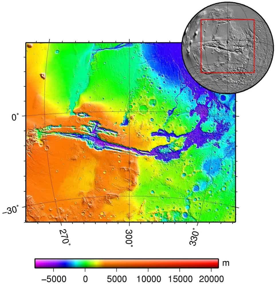 另一种可能性则是,撞击重新激活了位于奥德曼斯陨石坑东侧峡谷中的火山或间歇泉,让它们再度喷发,在当地的几处地形构造中,确实能找到这类活动留下的痕迹,无论如何,当火星大气层开始大量流失、水圈也逐渐消散时,水手谷早已基本成形。