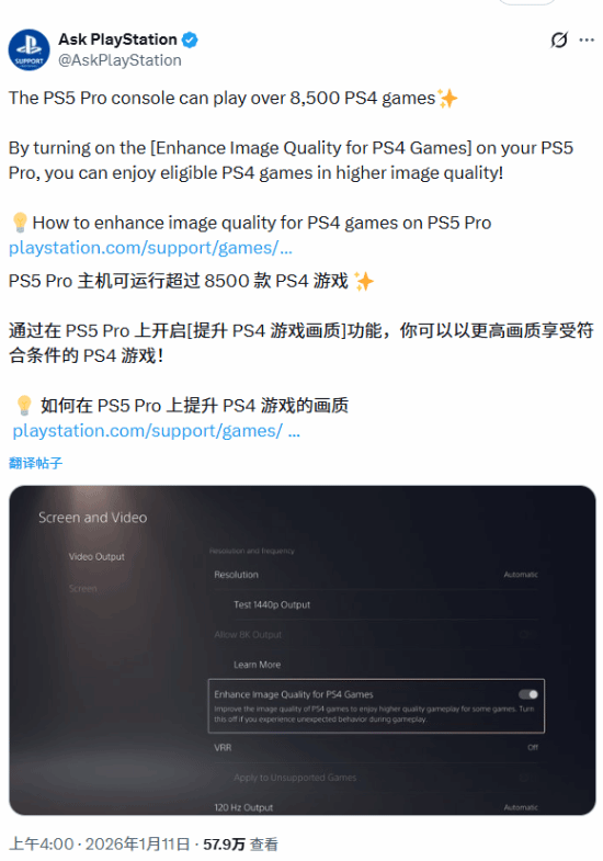 SIE 通过 “Ask PlayStation” 账号先后宣介:PS5 Pro 可兼容超 8500 款 PS4 游戏,开启 “PS4 游戏画质增强” 功能后可提升旧作画面表现;普通 PS5 则支持超 4000 款 PS4 游戏,支持数字版游戏与存档迁移。