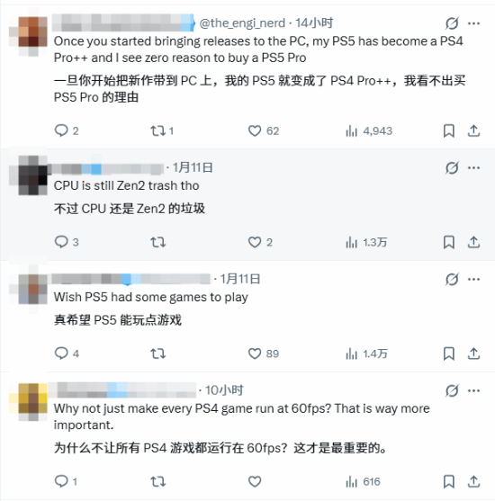 部分玩家表示 “让 PS4 游戏跑满 60 帧比提升画质更重要”,同时吐槽 PS5 的 CPU 性能仍显不足。