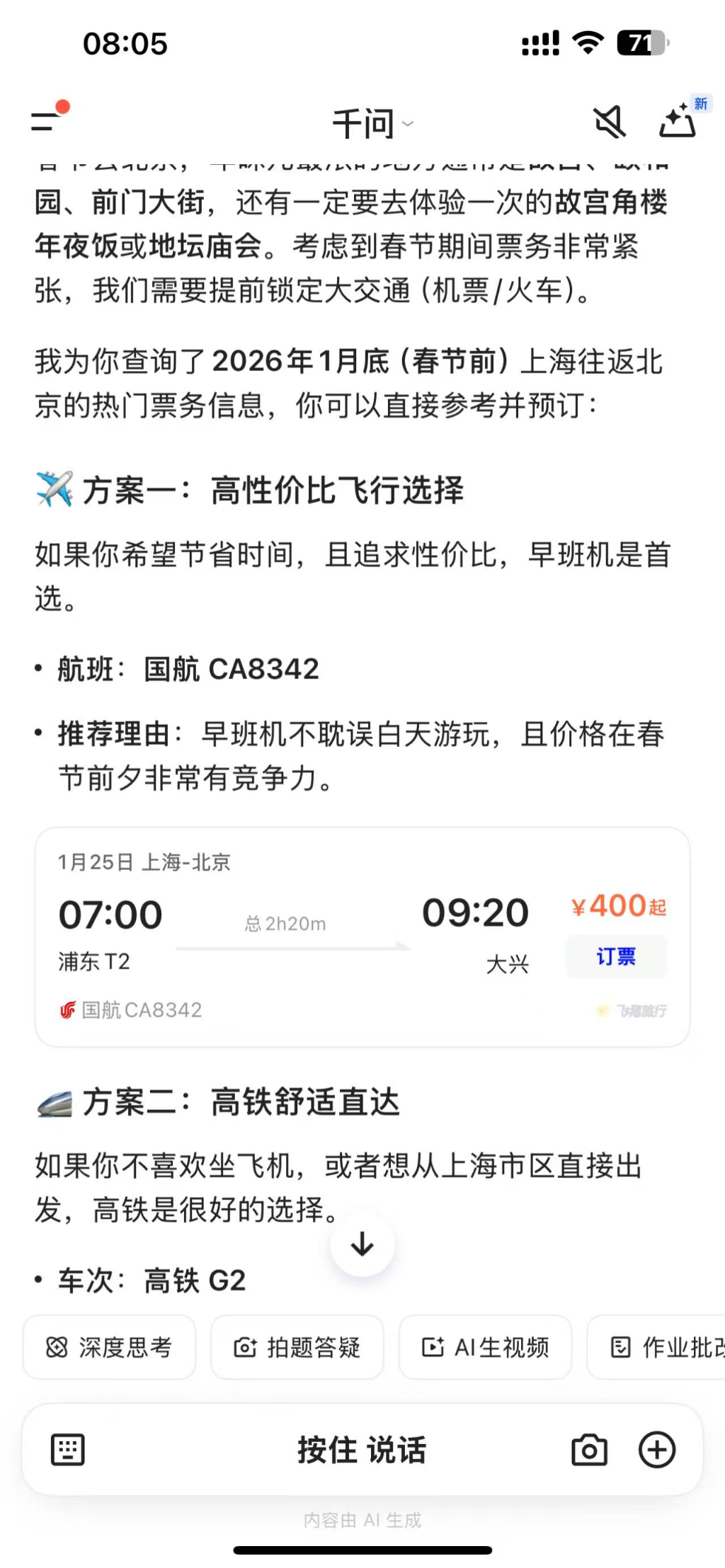 你不再需要在一个个App之间反复横跳比价。你只需要对千问说:“帮我订一张明天去北京的机票,要最早的一班”,或者“我想吃附近评分最高的轻食外卖”。AI会直接理解你的意图,调用后台数据,把最终的解决方案——甚至直接是支付按钮——送到你面前。