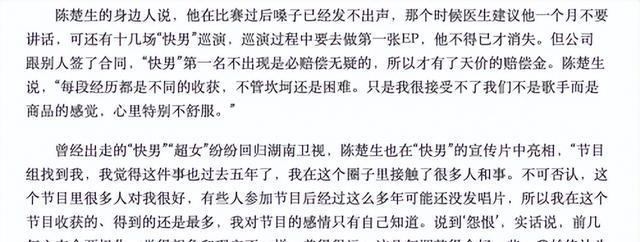 2012年11月,陈楚生与天娱传媒达成庭外和解。陈楚生在微博长文中表达了对湖南卫视和天娱传媒的感激之情,同时也对自己此前的冲动行为表示歉意。这一和解,不仅让陈楚生摆脱了“227亿”赔偿的沉重包袱,也为他后续合作奠定了基础。随后,2013年,陈楚生就出现在了《快乐男声》的宣传片里。