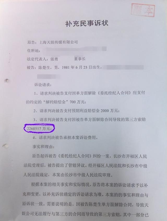 但实际上,“227亿”只是一个荒诞的笔误。2011年,陈楚生经纪人公布的《补充民事诉状》显示,天娱传媒要求的赔偿包括解约赔偿金700万元、预期利益赔偿金2000万元以及第三方索赔2268517万元。