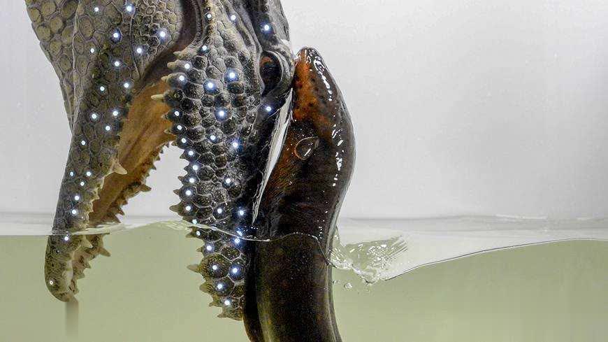 并且他也指出,和所有放电效应是一样的,电鳗放电也需要消耗它身体里的能量。 所以,电鳗已经学会使用以数百赫兹频率的脉冲电流破坏动物的神经元,这是一种非常高效节能的攻击手段。持续一段时间后,电鳗的猎物就会晕厥,抽搐、瘫痪,甚至死亡,这个时候电鳗就能平静地吞食猎物了。