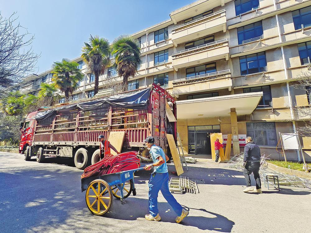 沿着院内道路往里走,记者看到工人们正忙着将现有3栋宿舍楼里的所有高低床架子和床板往外搬运。这些床铺是浅灰色新型号,可以反复拆装使用。记者上前询问搬运工得知,这些还能使用的床铺将被运往临沧,继续在其他学校发挥余热。