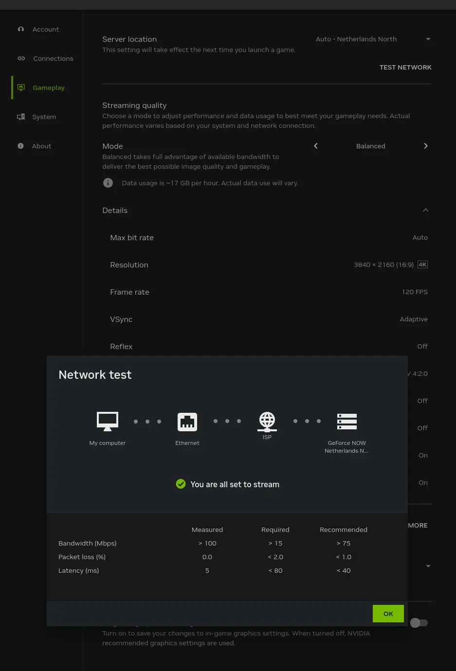 据科技媒体 Neowin 的测试,GeForce NOW 在 Linux 平台支持 YUV 4:4:4 采样和电影质量模式,云游戏视觉表现能够与 Windows 游戏电脑保持一致。在应用设置中可查看帧率、分辨率、滤镜等信息,并附带完善的网络测试工具。