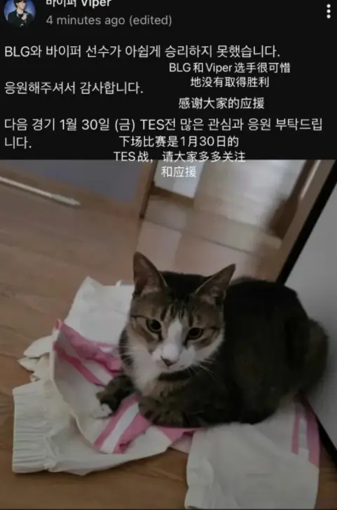 Viper晒照片惹争议,把BLG队服当脚垫,引起大量粉丝不满,Viper在社媒上总结不敌JDG的比赛,本来是一条再常规不过的赛后动态,却因为一张配图,意外点燃了舆论火药桶——他的宠物猫“蒙多”,正踩在BLG队服上。