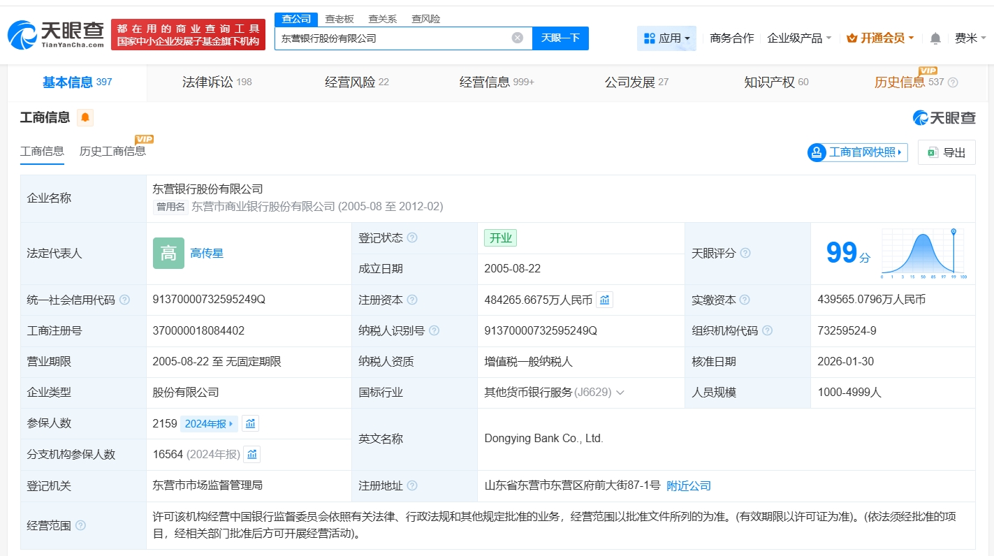 雷达财经讯,天眼查App显示,近日,东营银行股份有限公司发生工商变更,注册资本由约44亿人民币增至约48.4亿人民币,增幅约10%。