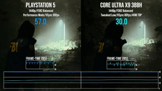 在性能测试中,团队选用了目前最吃配置的游戏之一《心灵杀手 2》。在尽可能贴近主机画质设定的前提下,并通过 AMD FSR 2(平衡模式)将画面放大至 1440p,英特尔的集成显卡不仅表现稳定,在部分场景下甚至略微超越了 Xbox Series S 的帧率表现。这意味着,一台轻薄笔记本如今已经可以实现与入门级本世代主机相当的画面质量与流畅度。