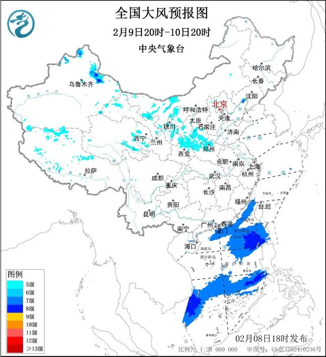 2月9日20时至10日20时,内蒙古西部、新疆北疆北部和东部、西藏西部、青海东部、甘肃东部和河西、宁夏大部、陕西中北部、山西南部、河南西部等地部分地区有5级风、阵风6~7级;台湾海峡、巴士海峡、南海东北部和南部海域将有7~8级、阵风9级的大风。