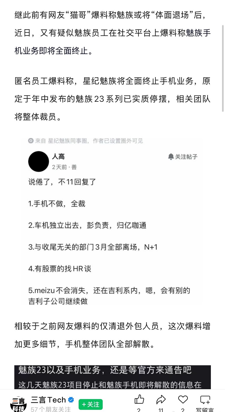其中最核心的信息莫过于:手机业务全面终止,相关团队整体裁员,原本备受期待、计划于今年年中发布的魅族23系列也已实质性停摆 。