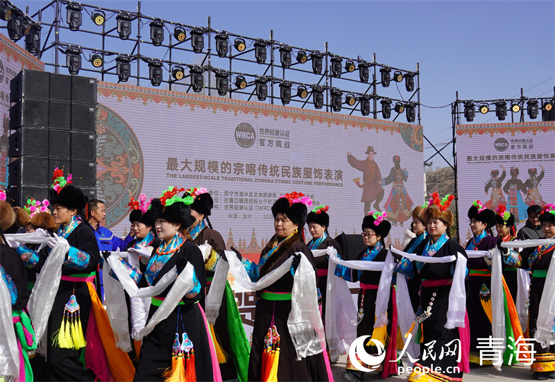人民网西宁2月27日电 (马可欣)2月26日,第一届拉科德哇宗喀传统民族服饰文艺展演活动在青海省西宁市湟中区拦隆口镇举行。1264名村民身着宗喀传统民族服饰,共同完成具有地域特色的集体舞蹈表演。