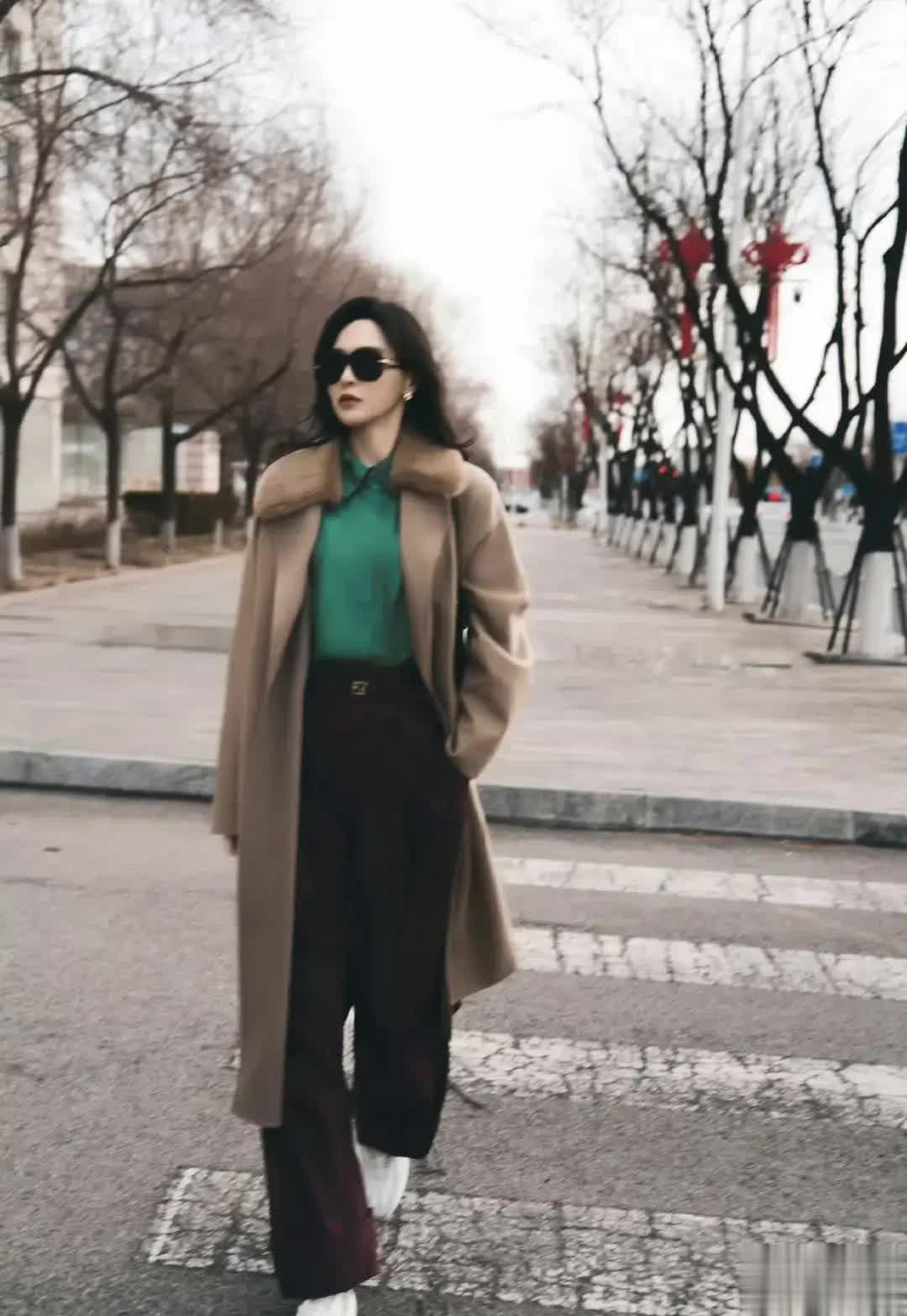 大衣采用合身直筒剪裁,哑光面料在自然光下泛着细腻肌理;墨绿与驼色的撞色搭配,既打破秋冬的沉闷,又透着复古的贵气;与《繁花》中“汪小姐”的职场形象遥相呼应。更有趣的是,这套造型被指精准“逆袭”了2025年米兰时装周的争议——当时唐嫣的咖色廓形西装曾被批“像中老年套装”,今年通过挺括版型与低饱和配色,彻底告别了“老气”标签。