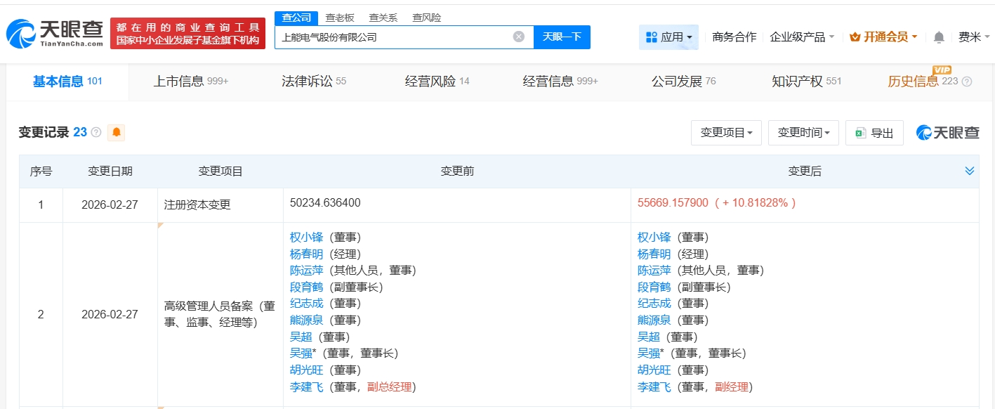 雷达财经讯,天眼查App显示,近日,上能电气(300827)发生工商变更,注册资本由约5亿人民币增至约5.6亿人民币,增幅约11%。
