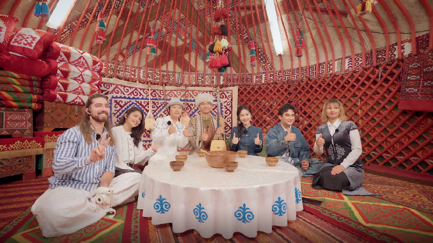 另一边,歌手李佩玲、努尔扎斯、张曦匀、王子则走入曼吉斯套州历史和地方志博物馆,了解阿克套的前世今生。歌手们脱鞋踏入博物馆的复原毡房,仰望被称为“尚勒拉克”的天窗。五彩的穗字“沙沙克·巴乌”寄托着家族兴旺的期许,而用来存放餐具的“阿亚克卡普”挂袋,被塞尔维亚歌手王子笑称为“传统冰箱”……这个小小的“移动家园”每一个细节都蕴含着游牧民族对自然的敬畏与适应。最令大家惊叹的,是展厅中来自中国景德镇的青花瓷碎片,这些在里海之畔出土的文物,无声地证明了阿克套作为古丝绸之路重要节点的历史地位,历史的回响也让歌手们对“一带一路”的当下有了更深的体悟,也为接下来的音乐创作埋下了文化伏笔。