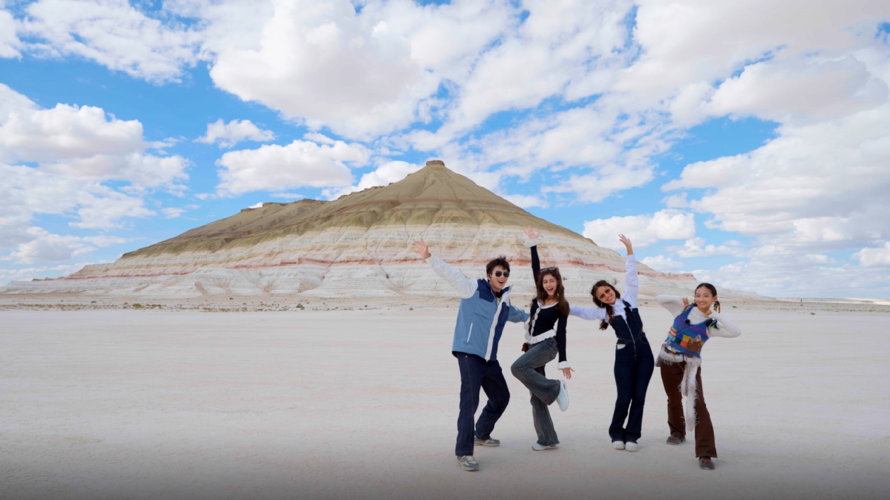 在基兹尔库普峡谷,歌手们被眼前这片酷似“提拉米苏”的地质奇观深深震憾。红、黄、白三色交织的岩层,如同巨大的千层蛋糕般层层叠叠。据当地向导介绍,红色的是铁矿,白色的是白垩石灰石,黄色的是沙土,这便是大自然最鬼斧神工的调色盘。如果说基兹尔库普是大地的甜点,那么博兹吉拉则是这片土地最深沉的咏叹调。作为哈萨克斯坦的“必打卡之地”,博兹吉拉以360度全景环绕的地貌奇观,给歌手们带来了前所未有的视觉冲击。歌手们在悬崖峭壁间感叹:“站在风化的天然雕塑前,你会突然明白,人生其实是一片旷野,我们需要的只是自由地呼吸。”歌手们在博兹吉拉峡谷不仅留下了足迹,更录下了风穿过岩层缝隙的呼啸声,这些声音将成为他们后续创作中最独特的采样。