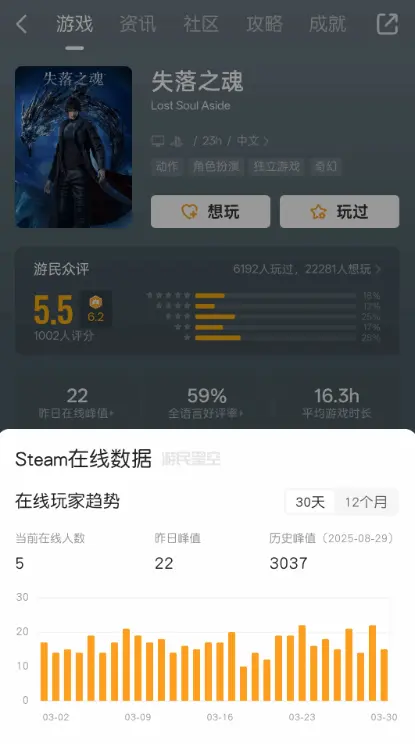 数据层面,该作在 Steam 平台的表现堪称惨淡。近日,其每日平均在线人数仅能维持在 20 人上下,这直接导致社区讨论区也一片死寂,鲜少有活跃的玩家交流。回顾其上线之初,《失落之魂》的 Steam 历史最高同时在线人数也不过 3037 人,这样的成绩单与它十年磨一剑的开发历程以及索尼 “中国之星” 计划的重量级背书相比,落差巨大到令人意外。