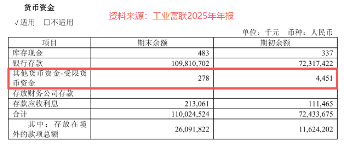 要知道,2025年工业富联的货币资金里面,有272.2亿元是以外币货币资金的形式存在的,占货币资金总量的25%。