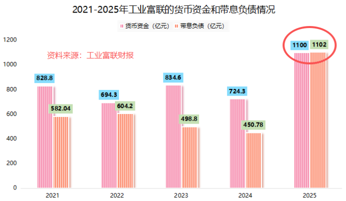 截至2025年末,工业富联账上的货币资金达1100亿元占总资产的24.11%;带息负债总额达到1102亿元,占总资产的24.15%两边都超过了20%,是典型的“存贷双高”现象。