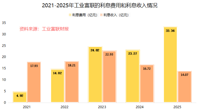 再看一组数据。2025年工业富联的利息收入是14.7亿元,远低于公司同时为带息负债支付的33.36亿元利息费用。这一进一出,使得公司的财务费用达到16.73亿元。
