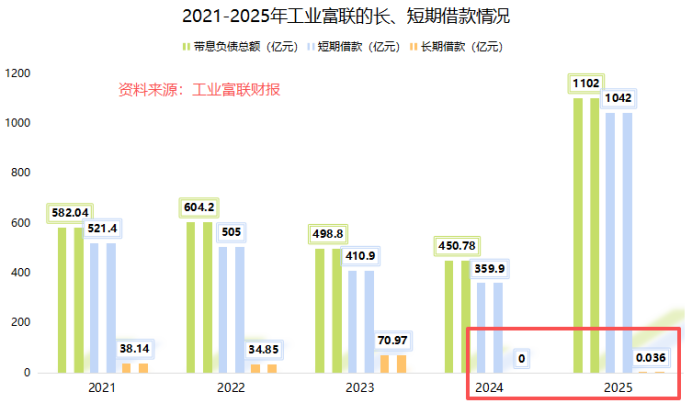 根据数据,2025年工业富联1102亿元的带息负债中,有1042亿元都是短期借款,同比猛增了190%,占带息负债总额的94.56%!