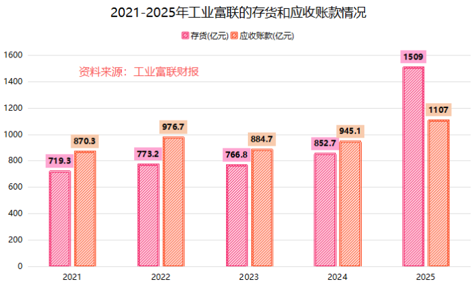 2025年,工业富联的存货蹿升至1509.13亿元,同比猛增76.99%。其中原材料占了四成,半成品和产成品也占了四成。