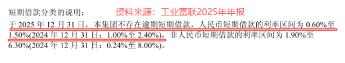 截至2025年底,工业富联人民币短期借款的利率区间仅在0.6%-1.5%。要知道,同期国内1年期贷款市场报价利率(LPR)都大约有3.1%。
